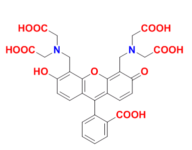 鈣黃綠素,也稱(chēng)為熒光素,熒光素復(fù)合物,是一種熒光鈣指示劑,其激發(fā)和發(fā)射波長(zhǎng)分別為495和515nm。鈣黃綠素在100 mM以上的濃度下會(huì)自動(dòng)猝滅。它用作EDTA滴定鈣離子和熒光測(cè)定鈣的絡(luò)合指示劑,微溶于水。質(zhì)子解離常數(shù)為pKa1的= 2.1,pKa2 = 2.9,pKa3 = 4.2,pKa4 = 5.5,pKa5 = 10.8和pKa6 = 11.7。鈣黃綠素溶液在酸性條件下發(fā)出黃綠色熒光,而在堿性條件下不發(fā)出熒光。但是,鈣黃綠素在堿性條件下在金屬離子(例如Al,Ba,Cu,Mg和Zn)存在下發(fā)出熒光。因此,鈣黃綠素還可以用于除Ca之外的這些重金屬離子的直接熒光滴定。