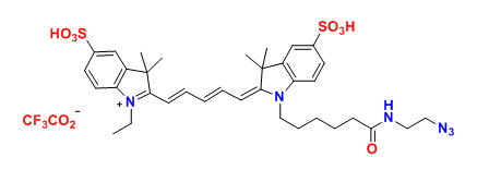 各種花青5(Cy5)染料已用于標(biāo)記生物分子,用于熒光成像和其他基于熒光的生化分析。它們廣泛用于標(biāo)記肽,蛋白質(zhì)和寡核苷酸等。Cy5 染料是最常見的紅色熒光團(tuán)中的一種。這些多功能熒光團(tuán)可以耐受3-10的pH范圍,用于生物相關(guān)pH的各種應(yīng)用。該染料還具有DMSO耐受性和光穩(wěn)定性,能夠在不損失性能的情況下從儲(chǔ)存轉(zhuǎn)移至分析。水溶性消除了在測定緩沖液中對有機(jī)溶劑的需要。我們的Cy5染料經(jīng)過全面QC測試,可確保高水平的發(fā)色團(tuán)和活性染料含量。單活性染料適用于蛋白質(zhì)和寡核苷酸的靶向,精確標(biāo)記,雙活性染料更適合于一般標(biāo)記。建議使用NHS酯染料標(biāo)記胺基,建議使用馬來酰亞胺染料標(biāo)記硫醇基團(tuán)。該Cy5 疊氮化物選擇性地與炔基反應(yīng)。